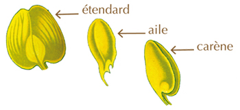 - La corolle est du type papilionacée : un large pétale dorsal, l’étendard ; 2 pétales latéraux, les ailes ; 2 pétales ventraux soudés renfermant les pièces fertiles, la carène. Les 10 étamines sont soudées entre elles par leur filet et forment une gaine qui entoure l’ovaire (au centre avec un style recourbé).