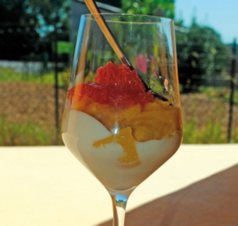 - Dans chaque verrine, déposer tout d’abord 3 c. à s. de yaourt à la vanille, rajouter la moitié de l’ananas et finir par les quartiers de pamplemousse.
