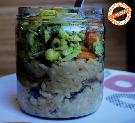 ⇒ Répartir le risotto dans 4 bocaux individuels, puis ajouter les légumes cuisinés par-dessus. Fermer les bocaux.