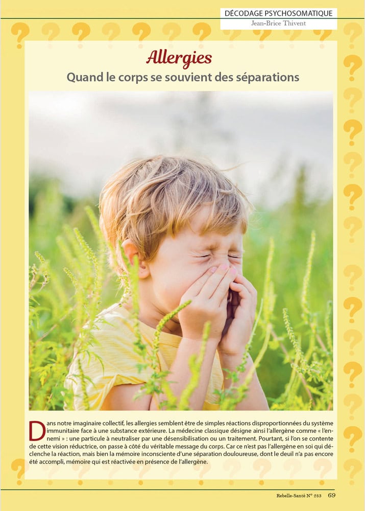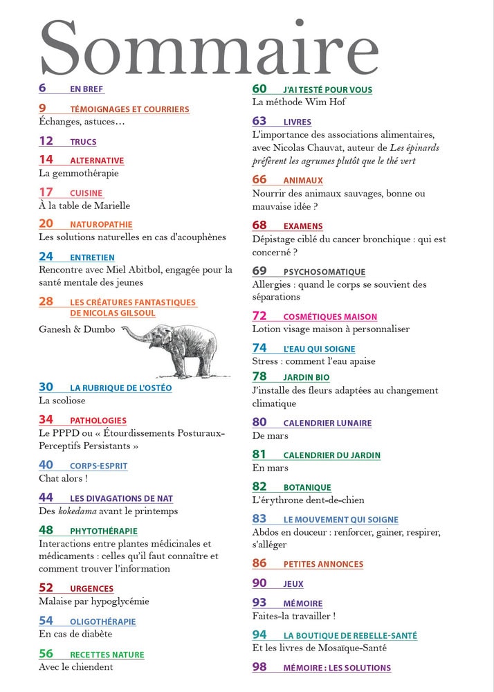 Dans ce numéro également, je vous invite à suivre Christophe Guyon pour plonger dans l’eau glacée, ça lui a fait grand bien. Moi, je préfère la capillothérapie du Dr Salmanoff (dans l’eau très chaude !)… Vous découvrirez aussi la jeune Miel, très engagée pour aider les jeunes à lutter contre le mal-être. Vous ferez la connaissance de Nicolas Chauvat, qui sait associer les aliments et les préparer pour en tirer le meilleur. Aline Mercan, quant à elle, vous donne de précieuses informations sur les interactions entre plantes médicinales et médicaments…
