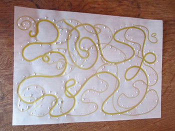 - De la même façon, on peut se créer des motifs scintillants en utilisant de la colle pour dessiner et en versant dessus des paillettes de plusieurs coloris.