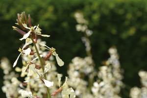 Haute de 20 à 60 centimètres, la roquette (Eruca sativa) donne de petites fleurs blanches ou jaunâtres et ce n’est pas pour son esthétique qu’on la fait pousser. C’est une plante annuelle facile à cultiver et très employée dans la cuisine italienne dont elle relève les salades, les pâtes, les pizzas…