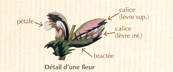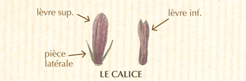 Le calice se divise en 4 pièces inégales : 2 lèvres pourpres surdimentionnées (la supérieure au-dessus de la corolle et l’inférieure, plus discrète, emboîtée dans la bractée) et 2 petites pièces latérales de couleur verte.