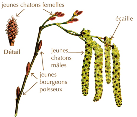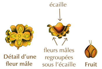 Les chatons mâles portent des fleurs apétales regroupées par trois sous une écaille rougeâtre. On distingue 4 sépales et 4 étamines.