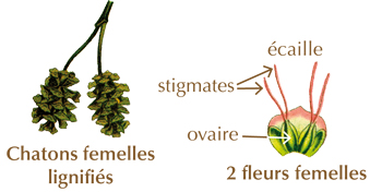 Les chatons femelles sont composés d’écailles portant deux fleurs réduites à 1 ovaire et 2 stigmates. Après pollinisation, les chatons femelles se lignifient et finissent par prendre l’apparence de petites pommes de pin.