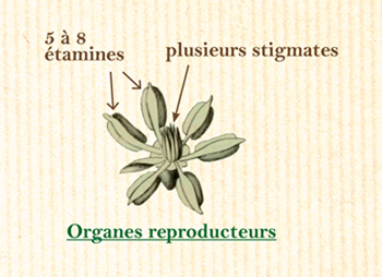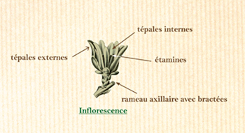 => Presque sessiles, les fleurs pendent au bout d’un petit rameau axillaire avorté couvert de petites bractées. Les fleurs sont en forme de coupe. Elles sont constituées de tépales externes translucides, à l’aspect cireux, blancs ou jaune soufre qui s’enroulent vers l’intérieur, et de tépales internes tachés de pourpre.