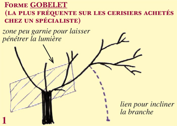 Il faut d’abord établir des charpentières équilibrées, bien reparties dans l’espace autour du tronc et de vigueur équivalente (diamètre). Il faut ensuite provoquer leur démultiplication en raccourcissant les rameaux d’un an, de façon à ce qu’ils ramifient. On construit ainsi un gobelet traditionnel ou une forme pleureuse. Cette dernière est aussi appelée «solaxe». Pour l’obtenir, on «plie» les branches charpentières (de une à trois) sous l’horizontale et on déclenche, en taillant leurs extrémités, l’apparition de rameaux axillaires.