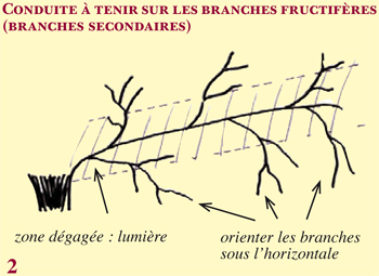 L’inclinaison des branches de 40 à 50° sous la verticale (pas plus !) se fait après la floraison. Elle ralentit la pousse et active la mise à fruits.