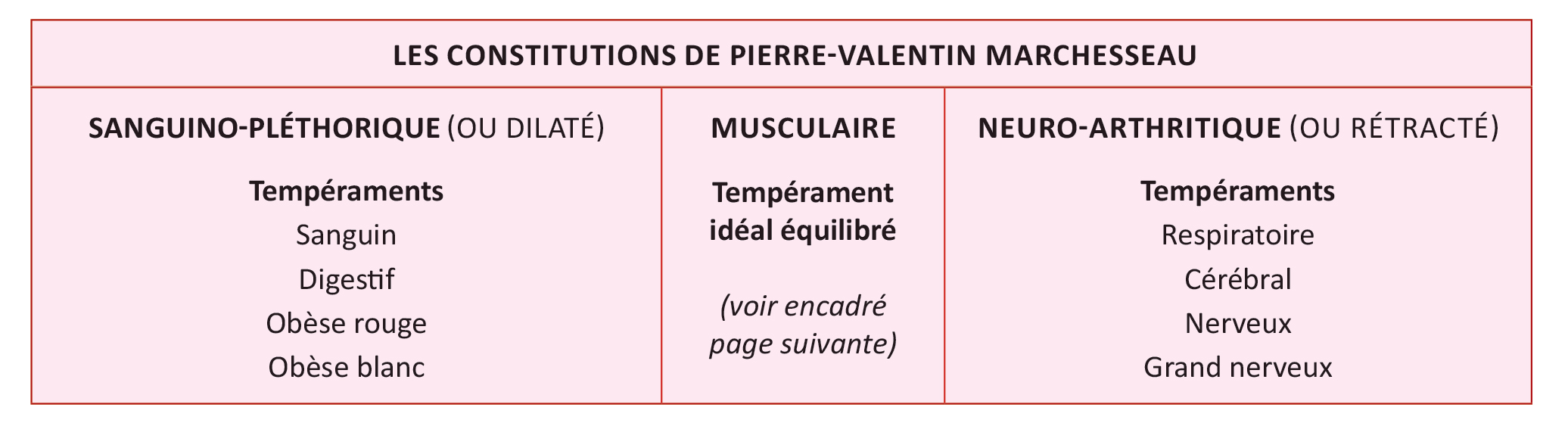 Les constitutions naturopathiques ont été déterminées dans les années 1930 par Pierre-Valentin Marchesseau, le « père » de la naturopathie. Contrairement aux constitutions hippocratiques, on ne distingue que 2 constitutions en naturopathie, elles-mêmes divisées en 9 tempéraments. Les constitutions et les tempéraments permettent de déterminer les tendances pathologiques et les stratégies nutritionnelles et d’hygiène de vie à adopter pour conserver ou retrouver une santé optimale. Le bilan naturopathique ne repose bien entendu pas uniquement sur la constitution. Il est établi en fonction de nombreux autres éléments.