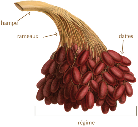 Les fruits sont regroupés en régime. Un régime, soutenu par une hampe très résistante, est issu d’une inflorescence femelle et est constitué d’une centaine de rameaux et de centaines de dattes. Un régime peut contenir environ 1000 fruits. Un palmier devient productif vers sa 7e année, sa production s’échelonne de 10 à 100 kg de dattes par an.