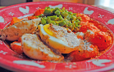 - Présentez l’assiette en laissant les pommes de terre dans le fond, rajoutez une part de poivrons verts et finissez par 3 demi-œufs.