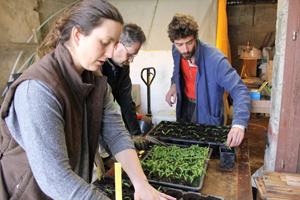 Xavier dispense ses conseils lors du repiquage de plants à Rachel et Alexandre.