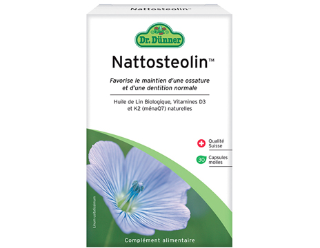 Formulées à partir d’huile de lin biologique riche en oméga 3 et en lignanes, de vitamine K2 issue du Natto (soja fermenté) et facilement absorbable, et de vitamine D3 naturelle, ces capsules 100 % végétales aident à conserver une bonne densité osseuse au moment où l’organisme en a le plus besoin (ménopause, bouleversements hormonaux lors de traitements médicaux et à partir de 65 ans chez les femmes comme chez les hommes). Sans OGM, sans gélatine, sans saccharose, sans sel, sans gluten, sans produit laitier… NattOstéolin peut être pris en continu.