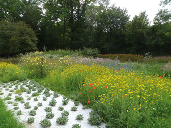 Arrivé au niveau le plus bas, c’est la zone humide avec l’étang où s’ébattent quelques canards. Résistant aux étés les plus secs, le point d’eau accueille des espèces végétales immergées 8 à 10 mois de l’année, qui elles-mêmes attirent des insectes, des oiseaux, puis des grenouilles et des poissons, apportant une autre vie dans ce coin du terrain et d’autres types de plantes rebelles, comme le lychnis fleur de coucou, le géranium des prés ou la guimauve officinale.