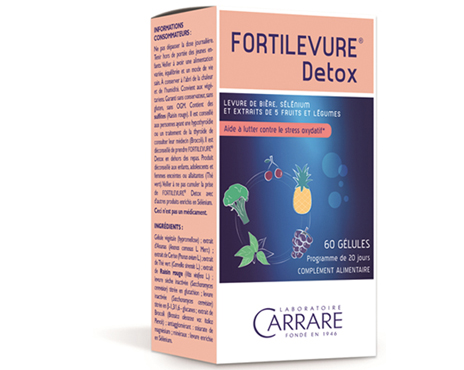 FORTILEVURE® Detox. Laboratoire Carrare. Boîte 60 gélules : 20,35 € – En vente en pharmacies, magasins spécialisés et sur internet – www.laboratoire-carrare.fr