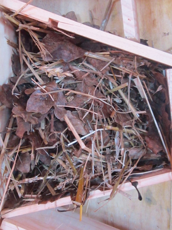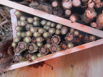 – Couper des morceaux de clématite sauvage (ou de ronce, fusain, sureau, ou tout arbuste à moelle molle) de la même taille que la profondeur de la caisse et les entasser dans l’autre cavité de l’étage. Remplir et bien tasser.