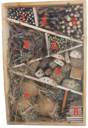 - Rondins de bois avec trous de différents diamètres = hyménoptères, abeilles solitaires.