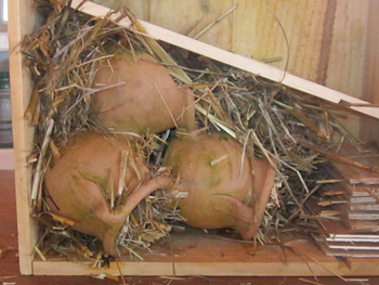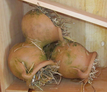– Au rez-de-chaussée sont déjà installés les pots de fleurs en terre cuite. Les remplir de paille, ne pas hésiter à bien bourrer toutes les cavités.