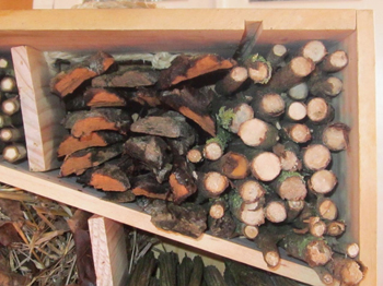 - Morceaux d’écorces empilés = coccinelles, insectes xylophages.