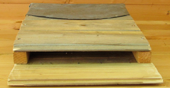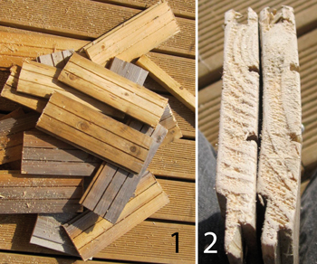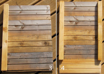 ⇒ Disposer les planchettes de la même façon pour l’arrière de l’abri, et rajouter une planchette dans le bas pour que les chauves-souris rampent facilement à l’intérieur. Poser les 2 tasseaux et agrafer les planchettes entre elles (photo 4). Les agrafes ne sont là que pour tenir les planchettes en place.