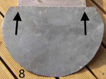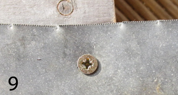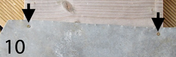 ⇒ Sur le haut de l’arrière de l’abri, positionner la chute de zinc (ou autre) et faire des trous avec une pointe et un marteau aux extrémités, à l’emplacement des tasseaux (photo 8).