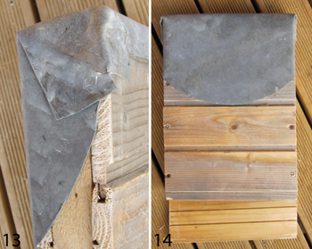 ⇒ Avec un marteau, aplatir le morceau de zinc sur le devant de l’abri et sur les côtés (photo 12).