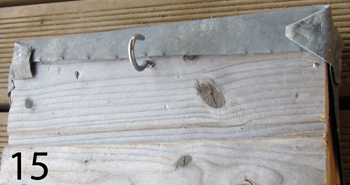⇒ À l’arrière, mettre le crochet. Le choisir assez long de manière à ce qu’il traverse la totalité de l’épaisseur de l’abri, afin que nos petites copines ne se blessent pas avec la pointe qui dépasserait à l’intérieur  ! (photo 15).