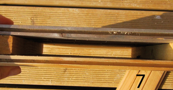 ⇒ Disposer les planchettes les unes à côté des autres (là, c’est le devant de l’abri) et poser un tasseau pour le recouper à la bonne longueur si nécessaire (photo 3).