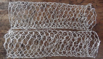 ⇒ Prendre un morceau de grillage à poule et l’enrouler sur lui-même pour former un tube grillagé. Le fixer entre les mailles avec du fil de fer fin. Faire de même avec l’autre morceau.