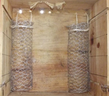 ⇒ Fixer les tubes grillagés dans les coins opposés de la caisse, glisser les cordelettes dans les trous. Positionner correctement les tubes posés sur le fond de la caisse avant de faire des nœuds derrière la caisse.