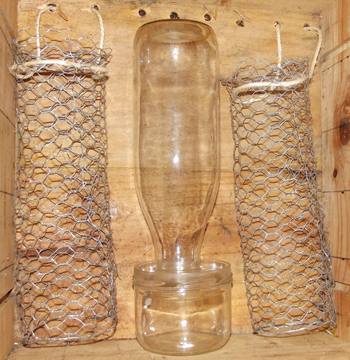 ⇒ Positionner la bouteille la tête en bas et le goulot dans le pot entre les tubes grillagés. Pour plus de facilité, coucher la caisse.