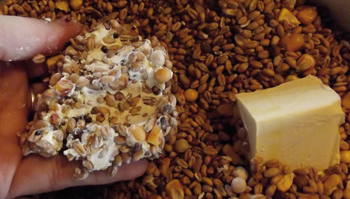 ⇒ Prendre un cube et le mélanger avec des graines. Bien malaxer en y incorporant des graines au fur et à mesure afin d’en mettre un maximum.