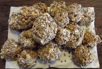► Les boules de graisse peuvent être placées dans des filets à pommes de terre (ail ou oignons) et accrochées un peu partout dans les arbres.